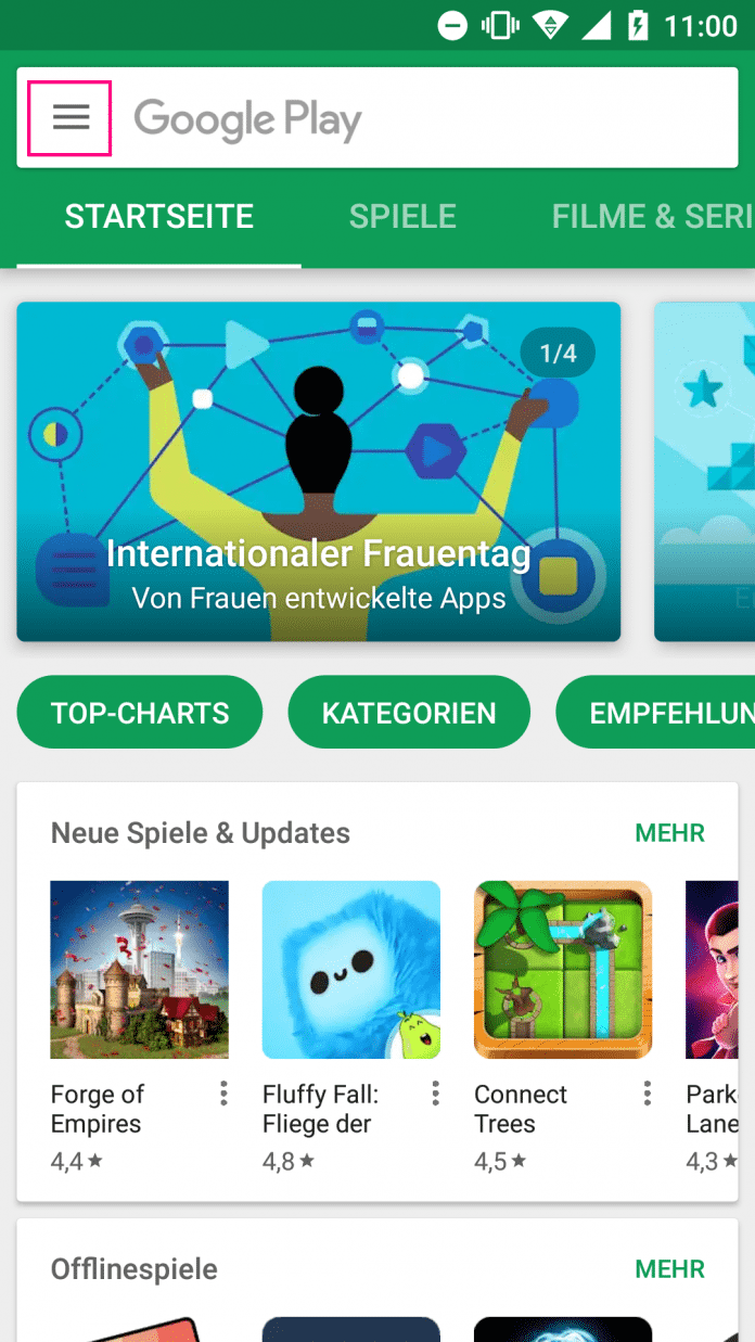 - Öffnen Sie den Google Play Store. Tippen Sie dort oben links auf das Menü-Symbol (☰).