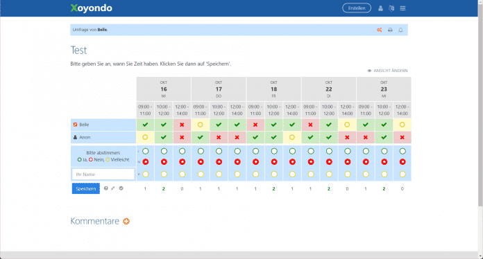 Xoyondo hieß früher einmal planiteasy. Das tool wurde mittlerweile grafisch grundlegend überarbeitet, der Datenschutz wird hier allerdings weiter großgeschrieben. Umfragen können ohne Anmeldung erstellt und beantwortet werden. Optional können Sie allerdings einen Account erstellen, um Ihre Umfragen zu überwachen. Für Pro-User und Unternehmens-Kunden gibt es kostenpflichtige Abonnements, die Zugriff auf weitere Features bieten. Die grundlegenden Funktionen, einschließlich Umfragen mit unbegrenzten Teilnehmern, sind allerdings weiterhin kostenlos verfügbar.