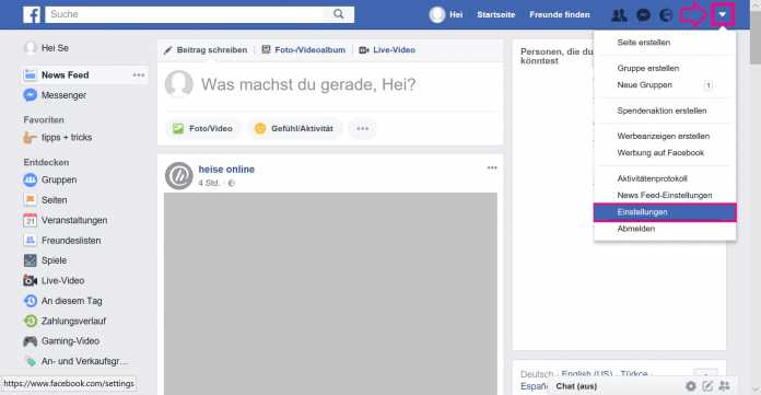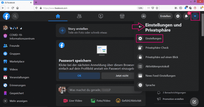 - Öffnen Sie Facebook im Browser und melden sich an. Öffnen Sie über den Pfeil oben rechts "Einstellungen und Privatsphäre" und dann "Einstellungen".