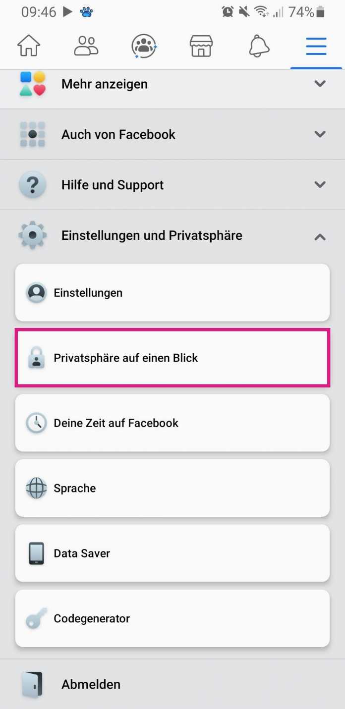 Tippen Sie in der Facebook-App auf das Drei-Strich-Menü oben rechts und wählen Sie unter "Einstellungen und Privatsphäre" den Punkt "Privatsphäre auf einen Blick" aus.
