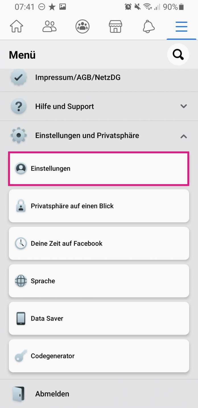 Tippen Sie in der Facebook-App oben rechts auf das Burger-Menü. Wählen Sie dann unter "Einstellungen und Privatsphäre" den Eintrag "Einstellungen" an.
