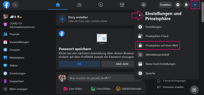 Melden Sie sich bei Facebook an. Klicken Sie auf den Pfeil oben rechts und wählen Sie "Einstellungen und Privatsphäre" und dann "Privatsphäre auf einen Blick".