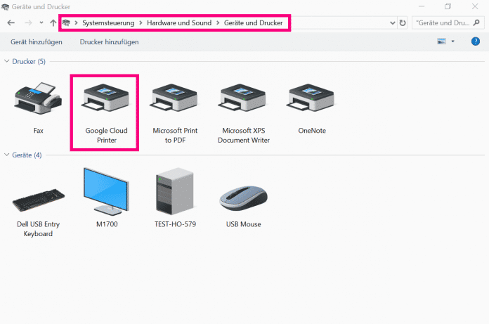 In der "Systemsteuerung" unter "Hardware und Sound" und dort unter "Geräte und Drucker" können Sie zur Überprüfung nachschauen, ob der Google Cloud Printer gelistet ist.