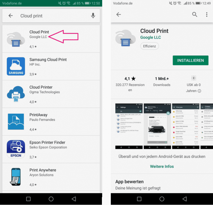 Hinweis: Es existieren mehrere Apps mit dem Namen "Cloud Print". Achten Sie deshalb im Play Store darauf, dass der angegebene Hersteller "Google" ist.