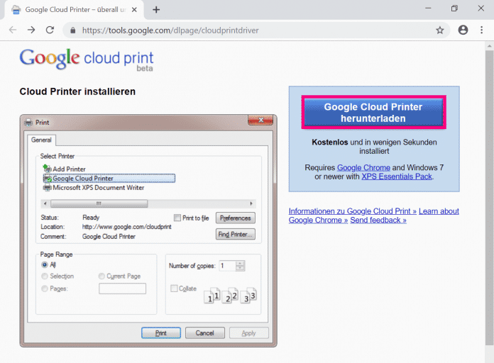 Laden Sie sich zunächst den Google Cloud Printer herunter und installieren ihn auf Ihrem Computer.