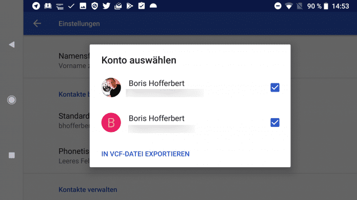- Falls Sie mehrere Google-Konten auf Ihrem Android-Smartphone eingerichtet haben, können Sie hier entscheiden, welche Kontakte Sie exportieren möchten. Wählen Sie die entsprechenden Konten aus und tippen Sie auf “In VCF-Datei exportieren”.