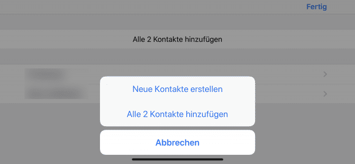 - Das iPhone öffnet nun das Menü “Kontakte hinzufügen”. Hier können Sie nun wahlweise durch “Alle x Kontakte hinzufügen” den kompletten Datensatz importieren oder einzelne Daten übertragen.