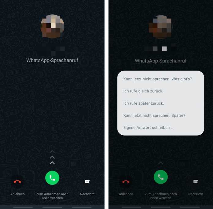 Ähnlich zur integrierten Telefon-App Ihres Handys können Sie auf einem Android-Handy bei einem WhatsApp-Anruf das Gespräch über den grünen Hörer annehmen oder über den roten Hörer ablehnen. Wischen Sie das Sprechblasen-Symbol nach oben, um dem Anrufer eine Ablehnungsnachricht zu hinterlassen.