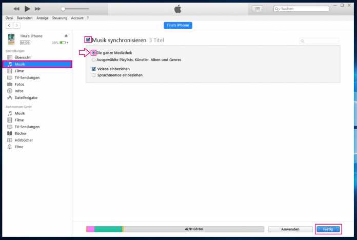 Klicken Sie dann links unter "Einstellungen" auf den Punkt "Musik". Setzen Sie einen Haken bei "Musik synchronisieren" und klicken Sie auf den Punkt neben "Die ganze Mediathek". SchlieĂźen Sie den Vorgang mit einem Klick auf "Fertig" ab.