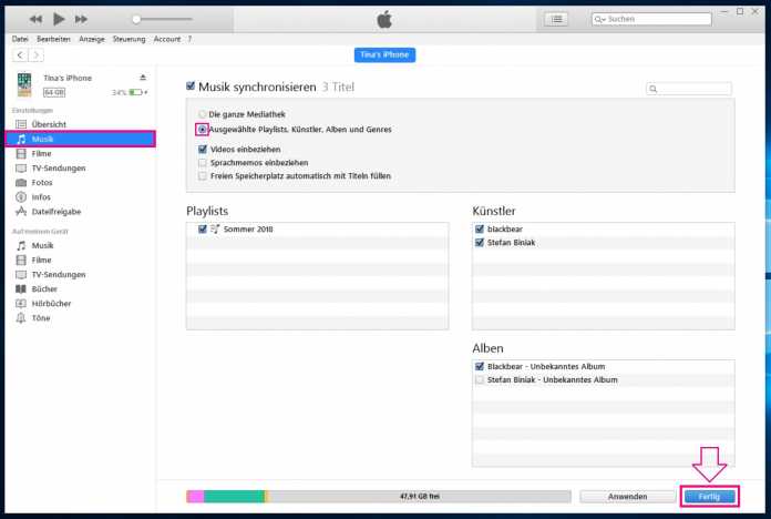 Möchten Sie nicht Ihre gesamte Mediathek, sondern nur bestimmte Playlists oder Künstler auf Ihr Gerät übertragen, gibt es auch dafür eine Option bei iTunes.