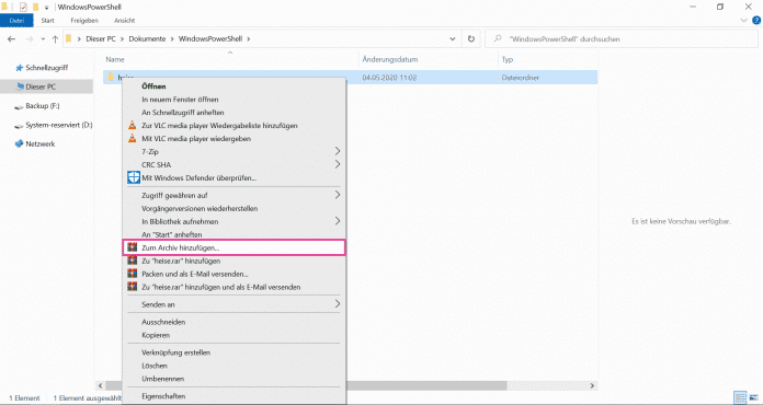 - Nach erfolgreicher Installation machen Sie einen Rechtsklick auf den Ordner und den wählen "7-Zip" und dann "Zu einem Archiv hinzufügen..." aus.