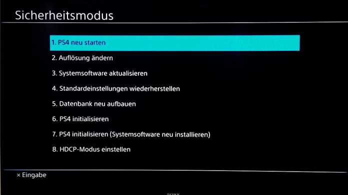 Sie befinden sich nun im Recovery- oder auch Sicherheitsmodus. Wählen Sie hier den Punkt 7 "PS4 initialisieren (Systemsoftware neu installieren)". Die Konsole installiert nun das Betriebssystem der PS4 vollständig neu und formatiert dabei die Festplatte. Sobald der Vorgang abgeschlossen ist, starten Sie die PS4 neu.