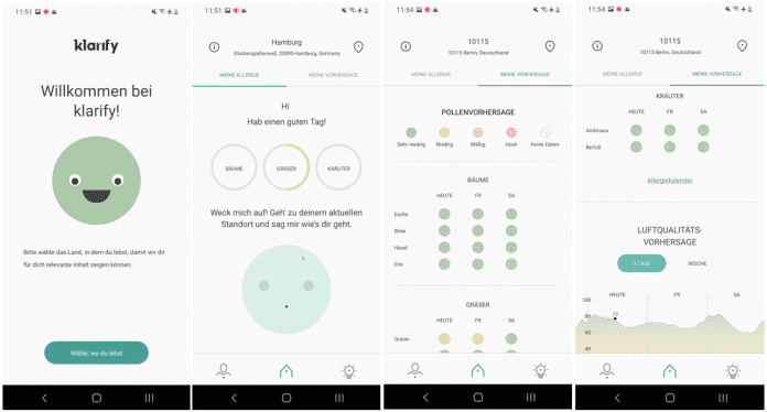 Die App des dänischen Start-Ups Klarify versorgt Sie mit einer Vorhersage zu Pollenflug und Luftqualität. Wenn Sie einen Account erstellen, können Sie die Anwendung an Ihre eigenen Bedürfnisse und an Ihren Standort anpassen und sich per Push-Nachricht informieren lassen. Außerdem gibt es in der App Tipps zur Behandlung von Allergiesymptomen. Niedlich ist der Smiley auf dem Startbildschirm, der je nach Pollenflug müde, verschnupft oder glücklich ist. Auch die Klarify-App ist kostenlos.