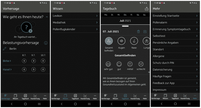 Wenn Sie sich einloggen, können Sie in einem Pollentagebuch Ihre Symptome festhalten, das Tagebuch ist wiederum die Grundlage für personalisierte Belastungsvorhersagen. Push-Nachrichten können Sie für verschiedene Zwecke einstellen, etwa für Eilmeldungen oder Erinnerungen an Arztbesuche. In Pflanzensteckbriefen können Sie sich über Allergene informieren. Die Pollen-App ist kostenlos.
