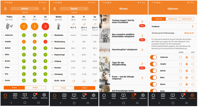 Außerdem finden Sie in der App Alltagstipps für Allergiker, die aber Werbung für Ratiopharm-Produkte enthalten. Die Anwendung bietet ein Pollenradar für Deutschland und Österreich, in einem Allergietagebuch können Sie allergische Reaktionen protokollieren. Gesamtbefinden, Augen, Nase und Lunge werden dort per Smiley-Skala abgefragt. Auch das Pollen-Radar ist kostenlos.