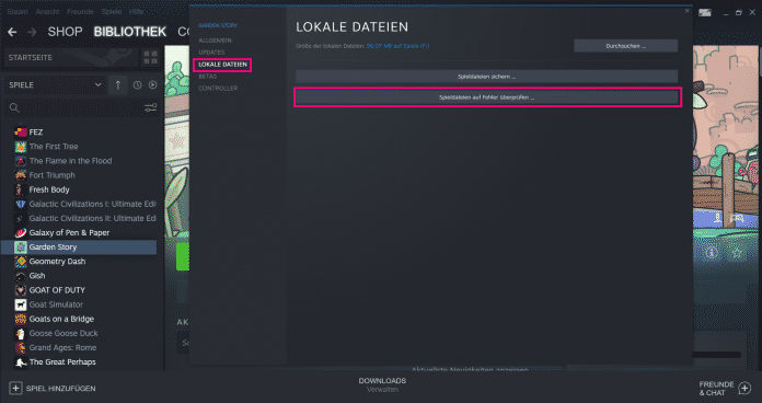- Steam-Spiel reparieren: Manchmal sind durch Updates oder Fehler beim Installieren die Dateien Ihres Games beschädigt worden. Klicken Sie mit der rechten Maustaste auf den Titel Ihres Spiels in der Liste. Wählen Sie nun "Eigenschaften" an und gehen Sie dort auf "Lokale Dateien". Hier können Sie dann "Spieldateien auf Fehler überprüfen..." lassen. Steam überprüft das Spiel nun und repariert automatisch potenzielle Fehler.