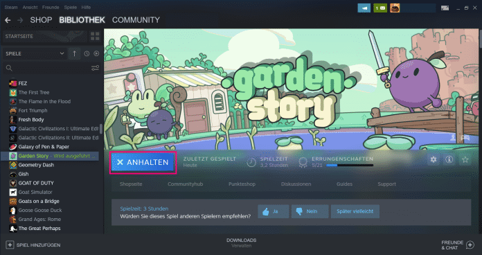 - Steam-Spiel anhalten und neu starten: Falls Steam Ihnen sagt, das Spiel würde laufen, obwohl es das nicht tut, können Sie in der Bibliothek einfach auf "Anhalten" klicken. Starten Sie das Spiel danach neu. Oftmals hilft das schon.