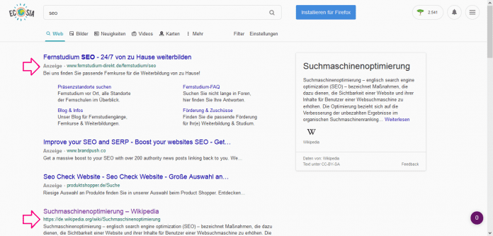 Bei den Suchergebnissen stehen Anzeigen ganz oben. Darunter folgen die organischen Suchergebnisse.
