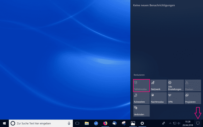 Manchmal hilft auch ein kurzzeitiger Wechsel in den Tabletmodus. Klicken Sie dazu unten rechts in der Taskleiste auf das Sprechblasen-Symbol und dann auf "Tabletmodus".