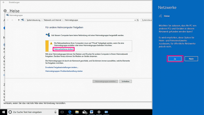 Wenn diese Option nicht für Sie verfügbar ist, können Sie auch versuchen, über die Einstellungen der Heimnetzgruppe den Netzwerktyp zu ändern. Gehen Sie zurück auf die "Status"-Seite in den Netzwerk-Einstellungen. Klicken Sie dann auf "Heimnetzgruppe". Wenn Sie die Option "Netzwerkadresse ändern" auswählen, erscheint ein Pop-Up. Hier müssen Sie auf "Ja" klicken, um den Netzwerktyp "Privat" einzustellen. Klicken Sie auf "Nein" wird Ihr Netzwerktyp als "Öffentlich" festgelegt.