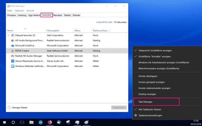 Im Autostart können sich einige Programme befinden, die ein korrektes Herunterfahren von Windows verhindern. Die Autostart-Optionen können Sie sich im Taskmanager anzeigen lassen. Um diesen aufzurufen, klicken Sie mit der rechten Maustaste auf die Taskleiste und wählen dann "Task-Manager" aus. Im Reiter "Autostart" werden Ihnen sämtliche Programme angezeigt, die sich im Autostart befinden.