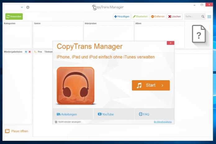 Der CopyTrans Manager ist wohl eine der bekanntesten iTunes-Alternativen. Die Nutzung soll unkomplizierter sein als von iTunes, der Manager ist aber auch mit weniger Funktionen ausgestattet. Vor dem ersten Gebrauch müssen Sie das CopyTrans Control Center installieren. Dieses enthält nicht nur den Manager für Musik, sondern auch weitere Tools für Fotos, Kontakte oder Kalender (die aber jeweils extra installiert werden müssen). Ist das Control Center auf Ihrem Computer geöffnet, folgt eine weitere Installation des CopyTrans Managers. Dann aber können Sie mit dem unkomplizierten Synchroniseren Ihrer Musik loslegen. Auch die Erstellung eines Back-ups ist mit diesem Programm möglich. Wie Sie mit dem CopyTrans Musik auf Ihr iPhone ohne iTunes laden können, erklären wir Ihnen in dieser Anleitung.