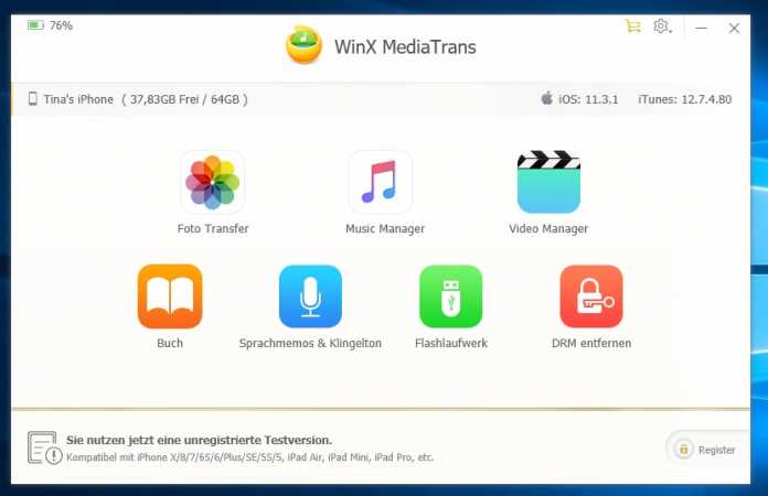 Mit WinX Media Trans können nicht nur Musik, sondern auch Bücher und andere Medien direkt übertragen werden. Sie können hier sogar iOS-Geräte als USB-Stick nutzen und dort verschiedene Dateitypen speichern. Das Programm zeichnet sich durch eine sehr schnelle Installation und eine schnelle Datenübertragung aus. Leider ist auch dieses Programm in der Vollversion nicht kostenlos (26,95€/Jahr)